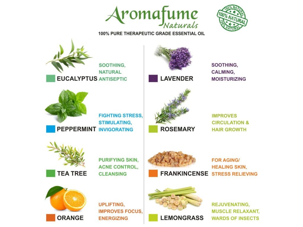 Aromafume Naturals nabízí kolekci čistých, přírodních éterických olejů vysoce inspirovaných přírodou. Každá lahvička je láskyplně plněna přírodním esenciálním olejem té nejvyšší kvality. Když tyto oleje použijete ve svém domě, přenesete se do svěžích zelených horských lesů a údolí ovocných sadů. Neustále se vyvíjející řada olejů zahrnuje neoblíbenější vůně: mimo jiné levandule, citronová tráva, pomeranč, máta peprná, eukalyptus, kadidlo, čajovník a rozmarýn.