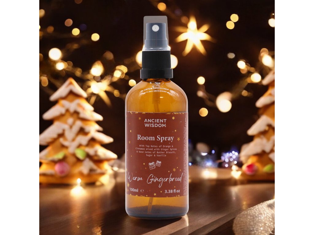 Ancient Wisdom Bytový sprej Warm Gingerbread (Horký perníček), 100 ml - bytový sprej s vůní čerstvě upečených perníčků. Sladké máslové tóny, koření, skořice, pomeranč a jemná vanilka vytvářejí útulnou vánoční atmosféru.