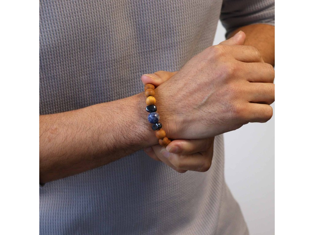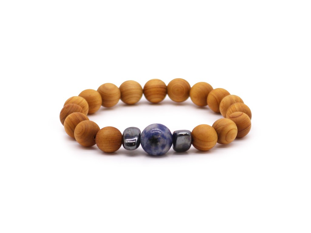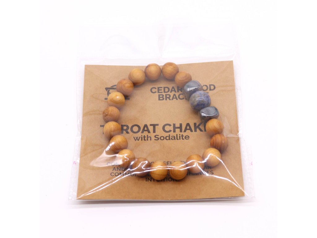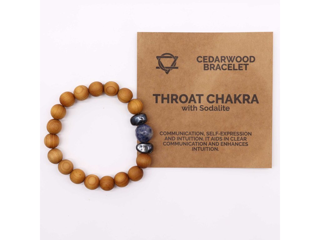 Ancient Wisdom Čakrový náramek z cedrového dřeva 5. Čakra Throat (krční) a Sodalit (korálky)