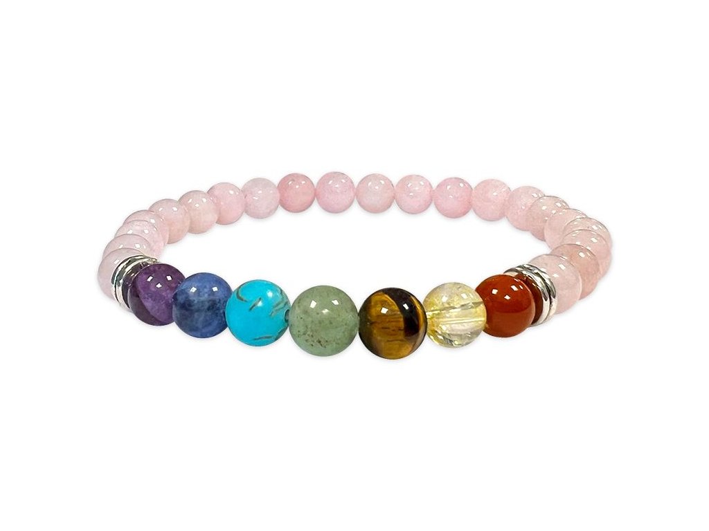 Tyto čakrové náramky obsahují drahé kameny - Růženín, Ametyst, Tygří oko, Červený jaspis, Vyhřívaný citrín, Zelený nefrit, Turquenit a Sodalit.