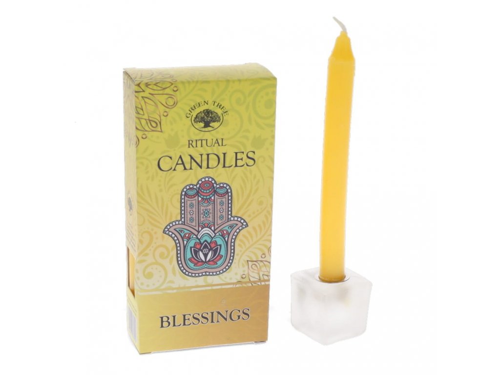 Optimistická žlutá barva zažehnává smůlu, podporuje pozitivní ladění osobnosti a chuť k přátelské komunikaci s okolím. Žlutá svíčka se dobře uplatní i na pracovišti, kde podporuje přátelské ovzduší a dobrou komunikaci. Žluté rituální svíčky zapalujeme, chceme -li podpořit sebevědomí, výřečnost, ale také studijní schopnosti a paměť. Žluté rituální svíčky se používají při věštění, proroctvích a meditacích, aktivují snění a přináší do života radost a naplnění všech tužeb.