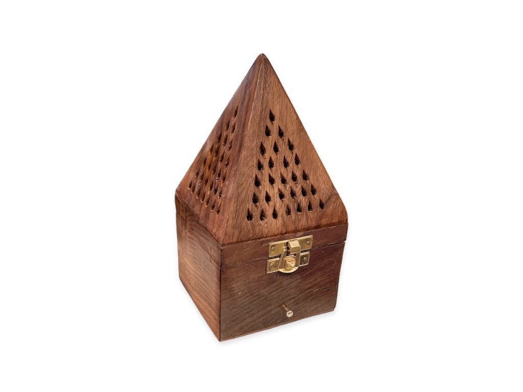 Stojánek na vonné kužely Pyramida s šuplíčkem Dřevo Sheesham, 16 x 9 cm. Dekorativní, ručně vyřezávaný a bohatě zdobený dřevěný stojánek na vonné kužely. Užijte si vykuřování vašich oblíbených vonných kuželů stylově. Dým z doutnajícího kužele pozvolna prostupuje otvory v pyramidě a vytváří nádherné kouřové efekty.