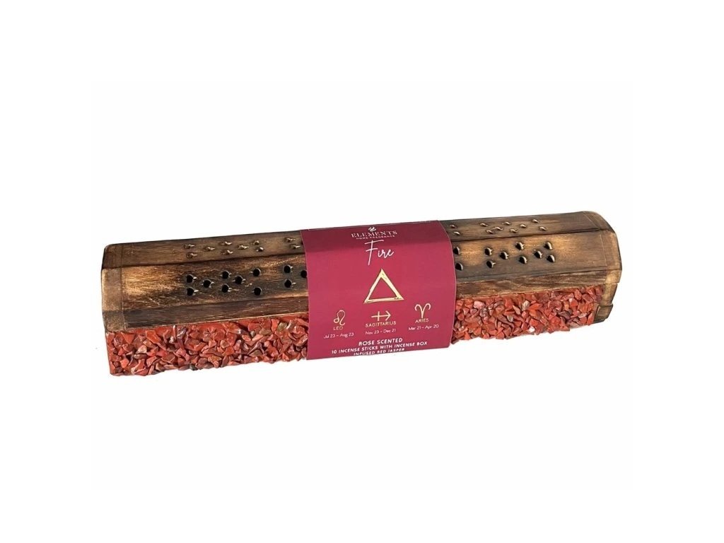 ARÔME Stojánek na vonné tyčinky a kužely – Dřevěná truhlička Elements Oheň s červeným Jaspisem, 30 cm. Ručně vyřezávaný stojánek zdobený přírodním Jaspisem. Vhodný pro pálení tyčinek i kuželů, se spodní přihrádkou. Součástí je 10 tyčinek s vůní růže.