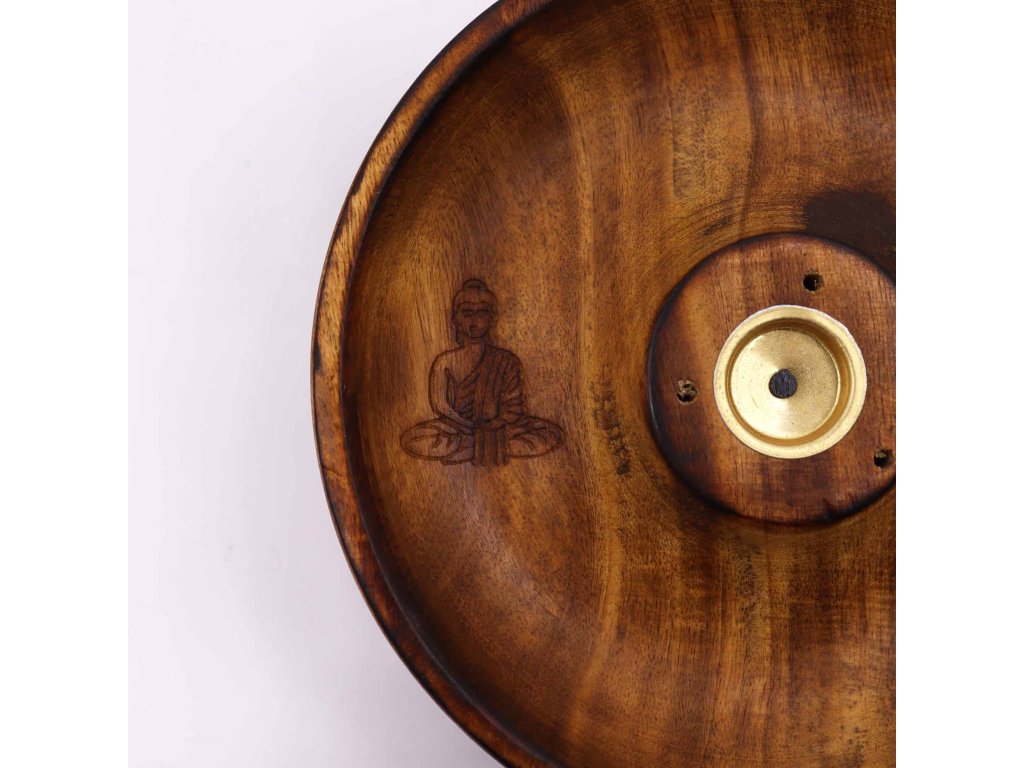 Stojánek na vonné tyčinky a kužely Buddha, 12 x 3 cm. Krásný dřevěný stojánek pro pálení vonných tyčinek a kuželů. Je to jemně zpracovaný kus, vyrobený z vysoce kvalitního dřeva v srdci Indie. Tento produkt ztělesňuje podstatu tradičního řemesla a kulturního bohatství. Stojánek je vyzdoben symbolem Buddha.