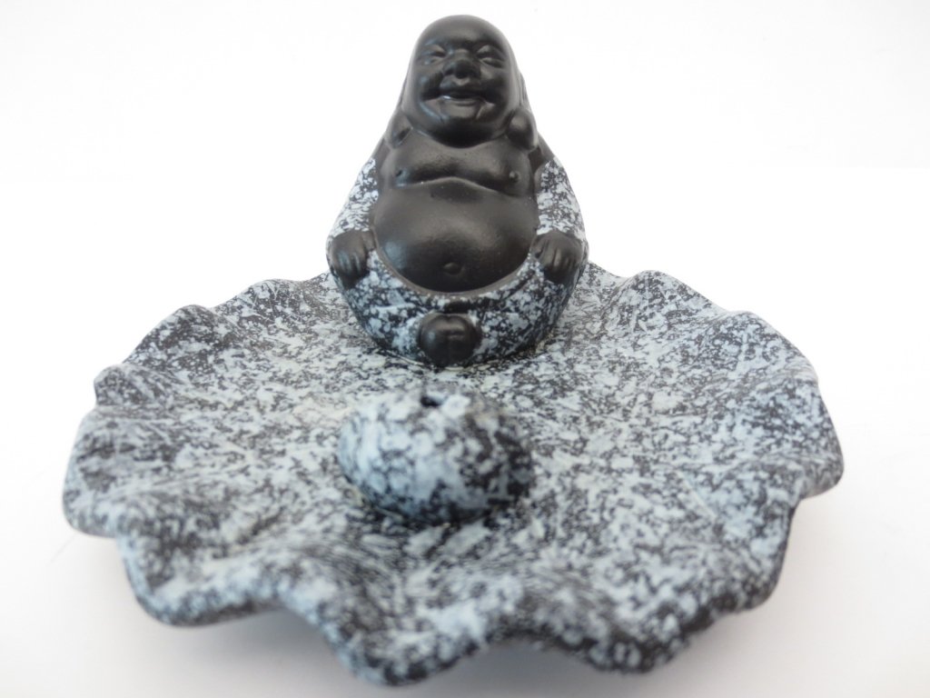 Stojánek na vonné tyčinky Černý čínský Buddha, modrá miska Květ Lotosu. Stojánek na vonné tyčinky s motivem černého čínského Buddhy. Vyznačuje se kvalitním zpracováním. Jemná vůně vonných tyčinek, v kombinaci s kvalitním provedením stojánku, dokáží navodit atmosféru čistoty a uvolněnosti.