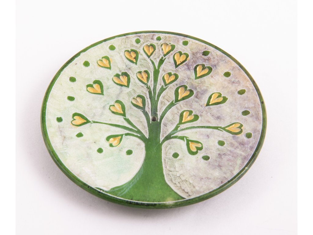 Ručně broušený stojánek na vonné tyčinky z mastku a bohatě zdobený symbolem Tree of life - Strom života