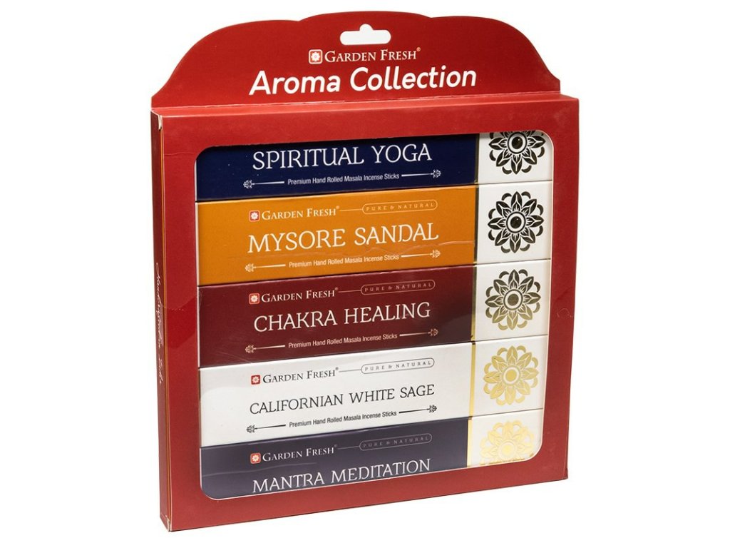 Vonné tyčinky Garden Fresh - Aroma Collection - Dárková sada, 5 x 15 g., jsou vyrobeny podle původních, tradičních a starodávných ayurvédských receptů. Přírodní látky, jako jsou dřevo, květiny, kořeny, pryskyřice, bylinky a oleje, se smíchají a ručně nanášejí na bambusovou tyčinku. Jsou 100% přírodní.