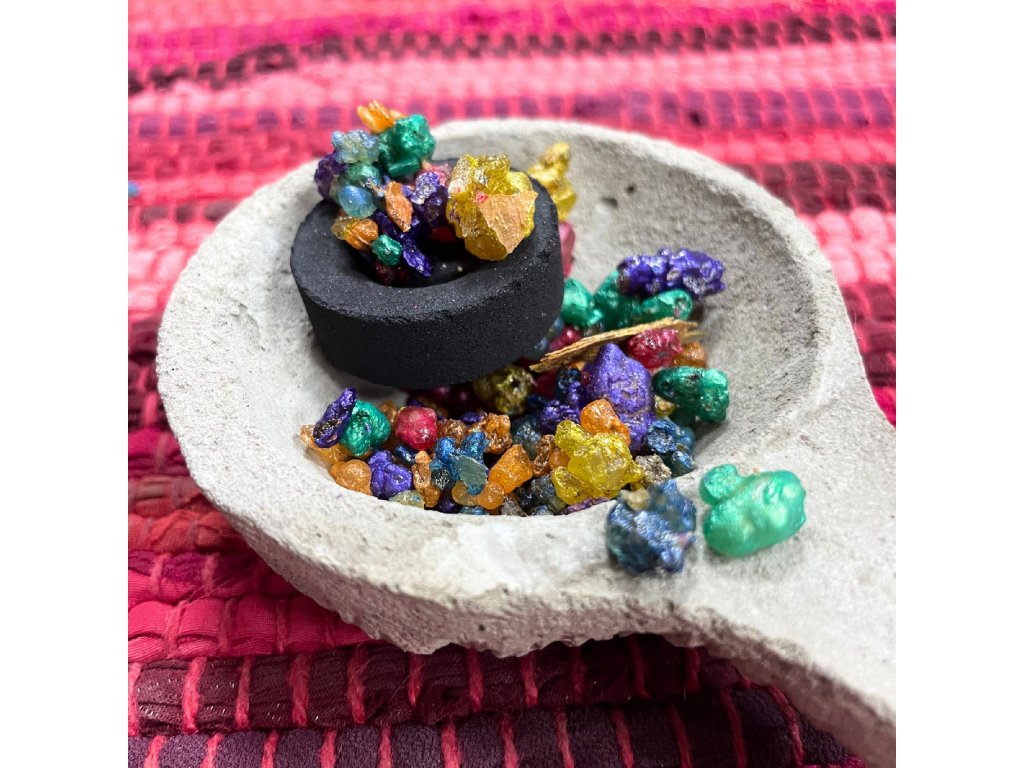 Použití: Pryskyřici přidejte na rozhořený rychlozápalný uhlík, který před tím uložte do vhodného ohnivzdorném stojanu, kadidelnice, nebo talířku určenému pro vykuřování. Pryskyřici je možné použít i na speciálních aroma lampách s jemným sítkem, které jsou určeny pro vykuřování.