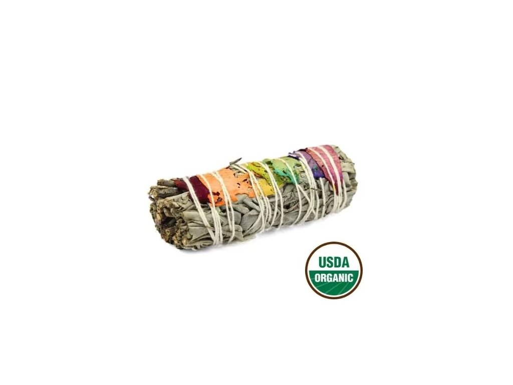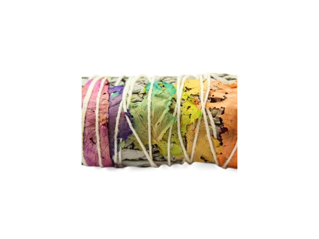 Bílá šalvěj (Salvia apiana) je tradiční posvátná bylina známá pro své očistné a ochranné vlastnosti. V tomto svazku je obohacena o sušené byliny a květy v sedmi barvách, které odpovídají jednotlivým čakrám – od kořenové až po korunní.