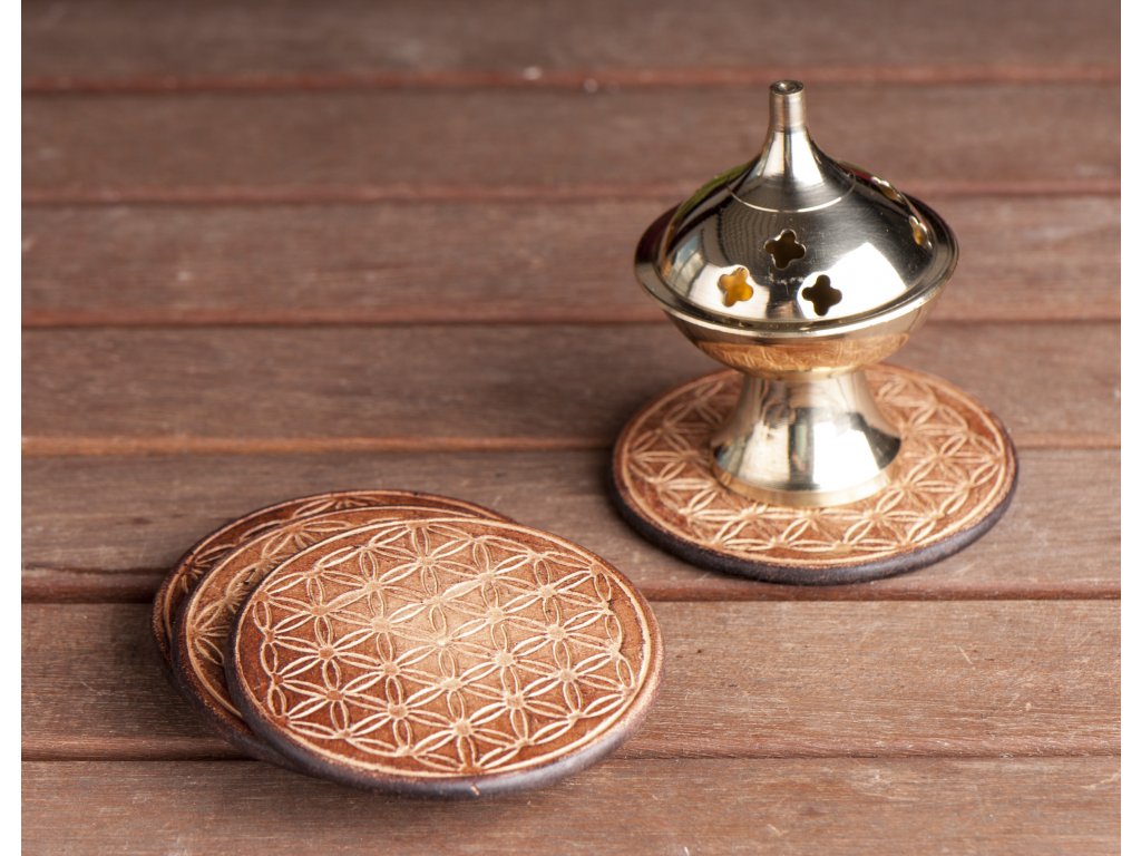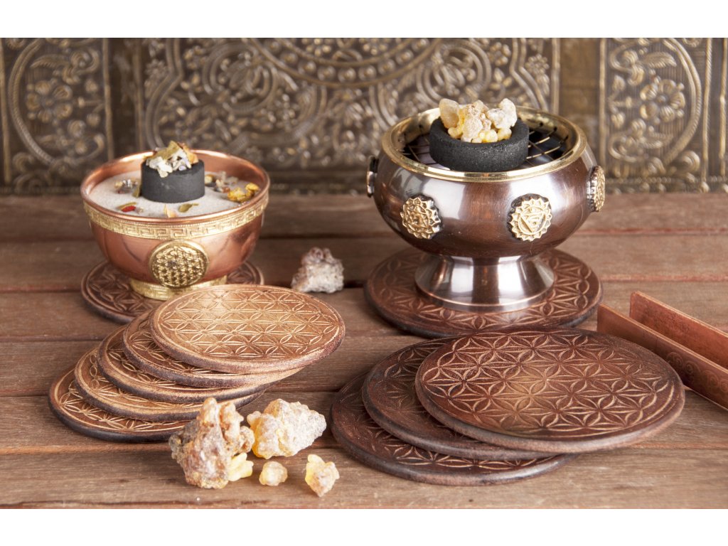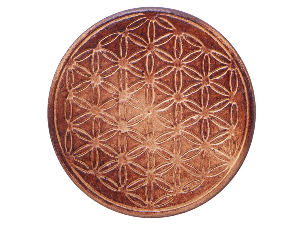 Dřevěný tácek pod vykuřovací misky je bohatě zdobený symbolem Flower of life - Květ života.